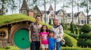 Farmhouse Lembang menghadirkan konsep wisata peternakan modern yang dibalut nuansa pedesaan Eropa. Pengunjung akan disambut dengan bangunan-bangunan bergaya Belanda yang ikonik serta replika rumah Hobbit yang unik, menciptakan latar belakang foto yang menarik di setiap sudutnya.